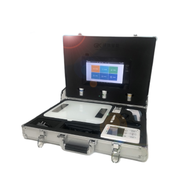 身高、體重、體質指數BMI、血壓(脈搏波)、脈率、血氧飽和度、血糖(空腹、餐后、隨機)、尿酸、膽固醇、美國卡迪克血脂四項(高密度脂蛋白、低密度脂蛋白、總膽固醇、甘油三酯)脂肪含量、水分含量、基礎代謝、體型判斷、腰圍、臀圍、腰臀比、心電:六導和十二導心電、體溫、中醫體質辨識 ,前置高清攝像頭。A4打印報告、身份證刷卡登錄、數據查詢、數據統計等